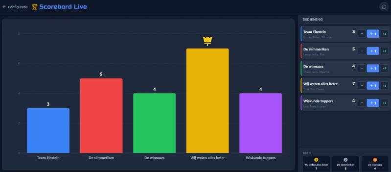 Wanneer leerlingen een opdracht af hebben komen ze bij jou als docent om deze te laten controleren. Met behulp van de applicatie Scorebord Live kan je dan live de stand bijhouden en deze op het digibord projecteren.