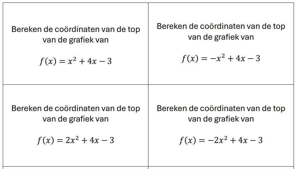 Bij binnenkomst stuur je leerlingen in groepjes van drie naar de whiteboards (als je die hebt) en laat je ze de coördinaten berekenen van de top van de gegeven parabool (op ieder whiteboard hangt een klein briefje). Je vraagt ook aan de leerlingen om rond te kijken bij anderen of ze kunnen ontdekken wat het verband is tussen de opdrachten.