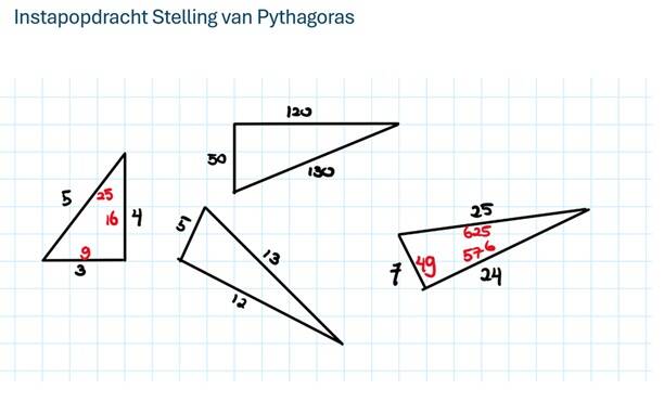- Laat iedereen achter zijn/haar tafel plaatsnemen en behandel de Stelling van Pythagoras, liefst met verwijzingen naar wat leerlingen hebben gedaan