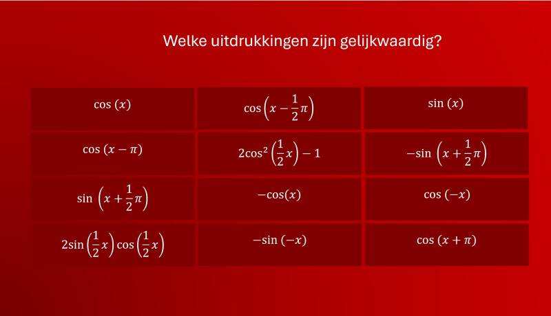 Perfect wanneer leerlingen werken met goniometrische formules om vergelijkingen op te lossen. In deze speelse puzzel komen die regels nog eens op een andere manier terug – een leuke én leerzame afsluiting van de les!
