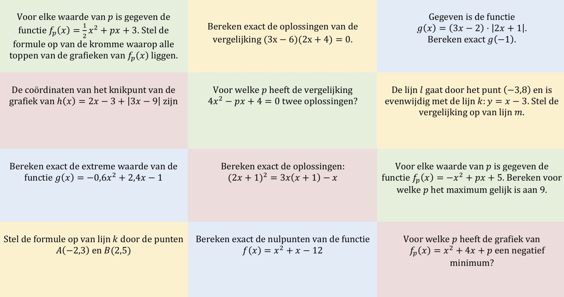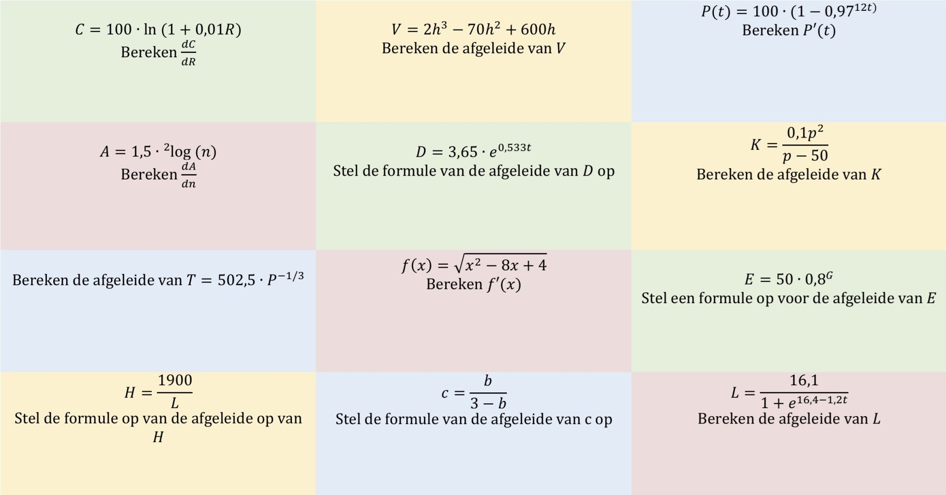 Deze oefening kan gebruikt worden wanneer wiskunde B hoofdstuk 3 is afgerond. Met behulp van deze vragen wordt op verschillende niveaus de stof herhaald. Bovendien kunnen leerlingen, maar ook jij als docent, bepalen op welk niveau ze zitten.